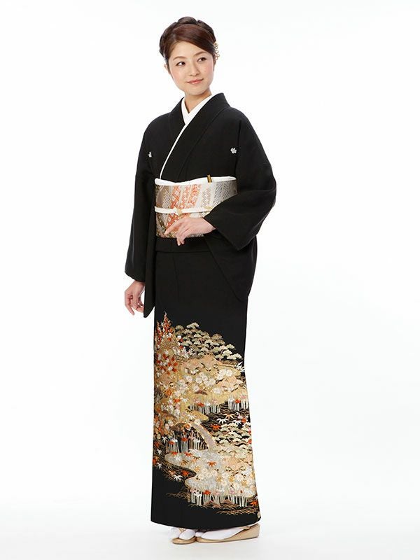 細やかな手刺繡のハイクラスの黒留袖は、金糸を惜しげもなく使用し、品がいい印象でございます。当店でも人気のおススメの高級留袖です。 |