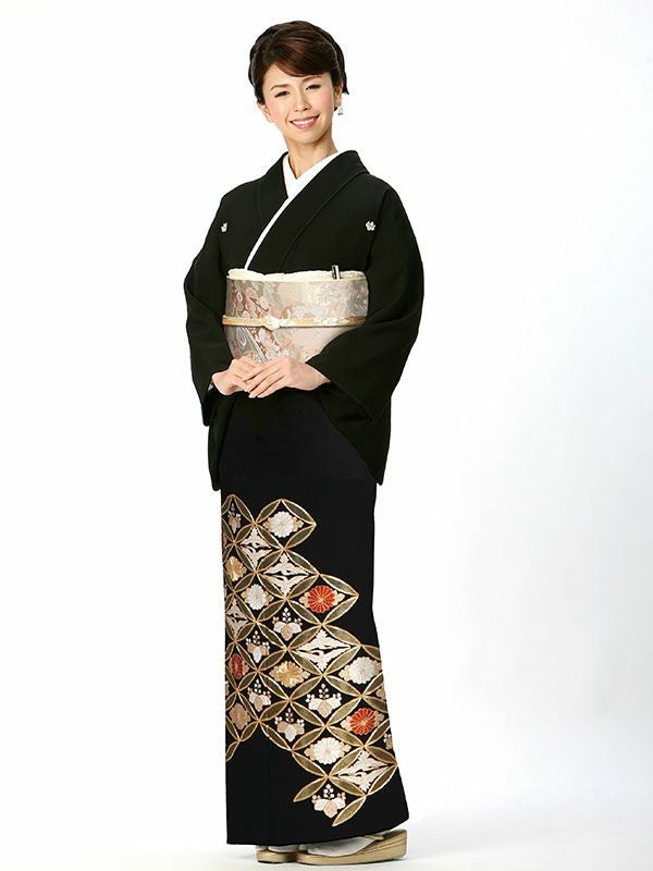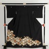モダンで洗練された印象の黒留袖ですが、伝統的な吉祥柄である七宝や桐、菊、鶴を描いた格式高い留袖です。色数を抑えて金糸を引き立たせたスタイリッシュな一枚です。 |