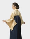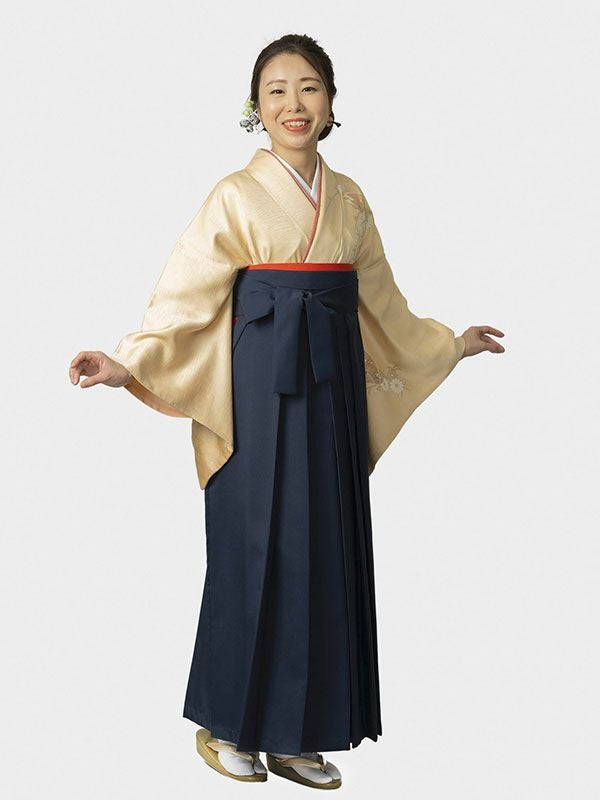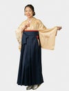 ■レンタル袴「和服美」の訪問着、絹100%「クリーム 扇面」のポイント やさしいクリーム色で、上品な印象。 濃い色の袴を合わせることで着やせ効果もありスッキリ。格式ある礼装の訪問着との組み合わせなので、安心してご利用いただけます。