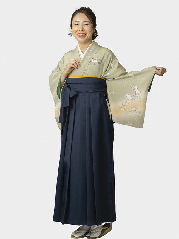 ■レンタル袴「和服美」の訪問着、絹100%「薄緑 草花」のポイント 小花でやさしく、落ち着いた雰囲気の着物です。年齢幅も広く、ご利用いただけます。格式ある礼装の訪問着との組み合わせなので、安心してご利用いただけます。